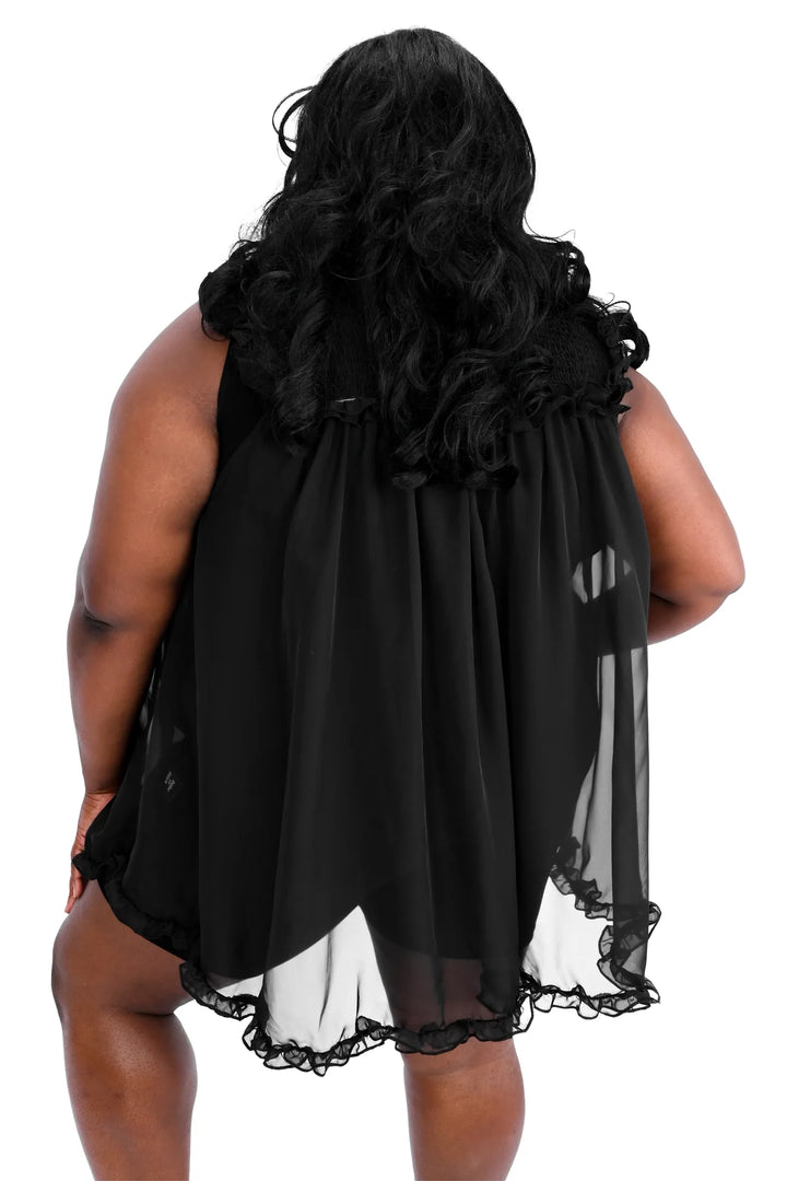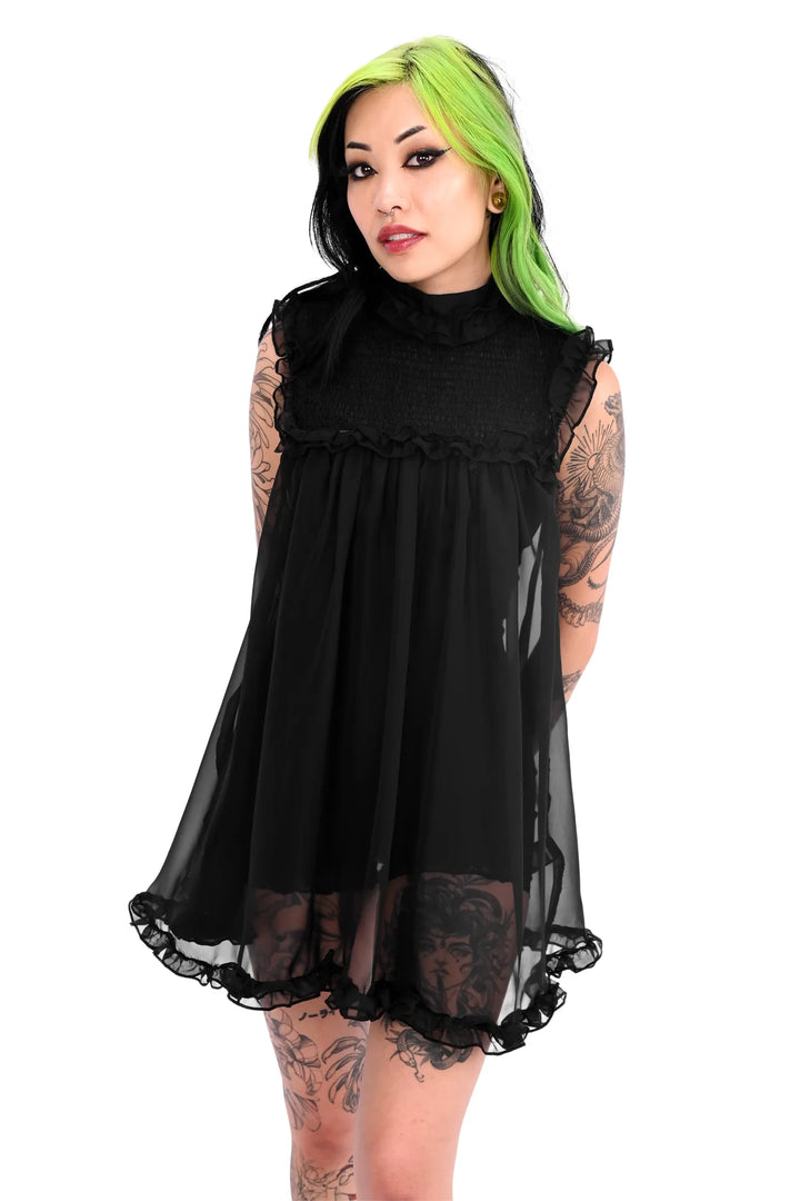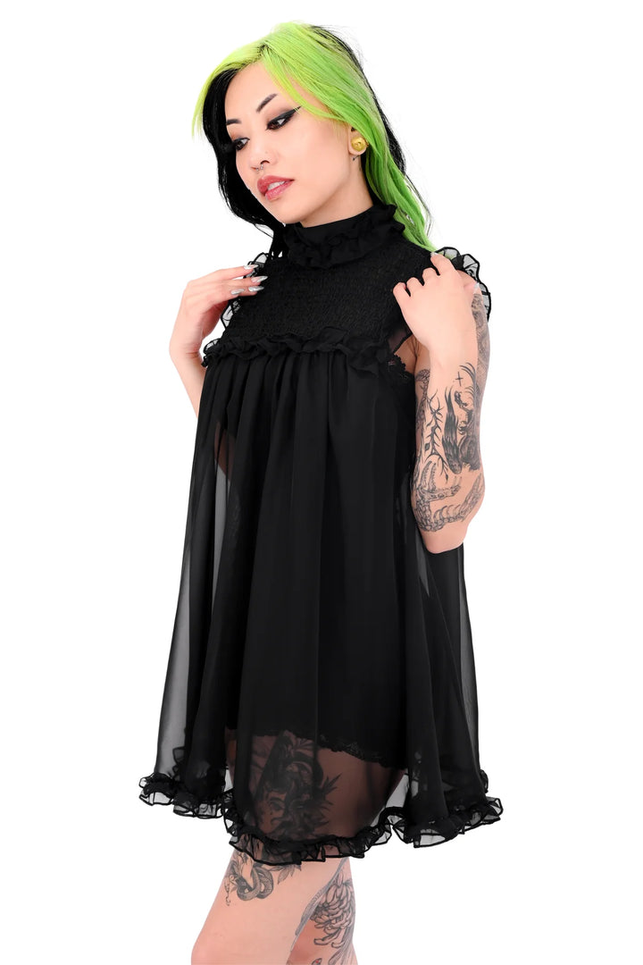 Crafted in sheer black chiffon with a smocked high neckline, ruffled trim, and a flowing oversized silhouette, it’s the perfect piece for layering or making a statement all on its own. The keyhole button closure in back adds subtle detail, while the airy fabric creates movement with every step. Whether you style it with boots, fishnets, or nothing but attitude, this babydoll is built for unapologetic nights and rebellious hearts.