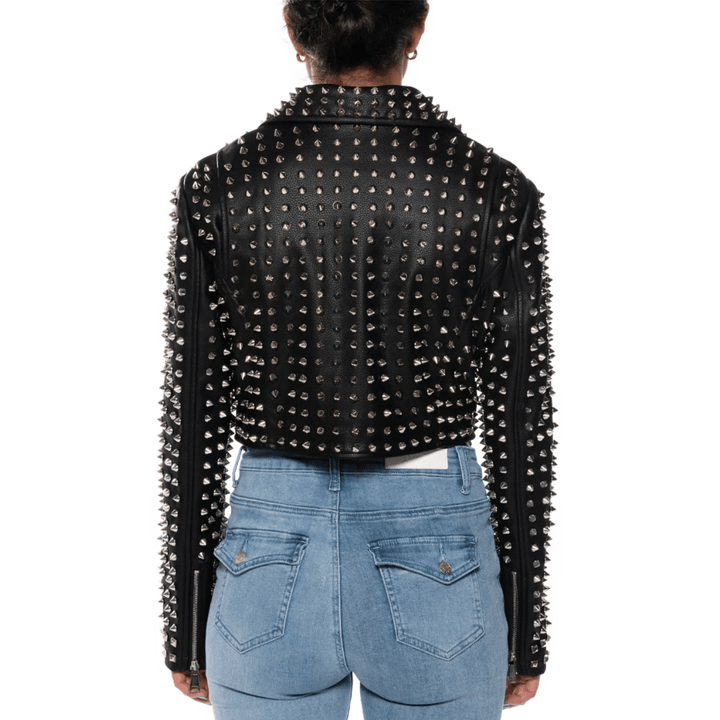 • Design: Fully studded vegan leather with cropped moto length